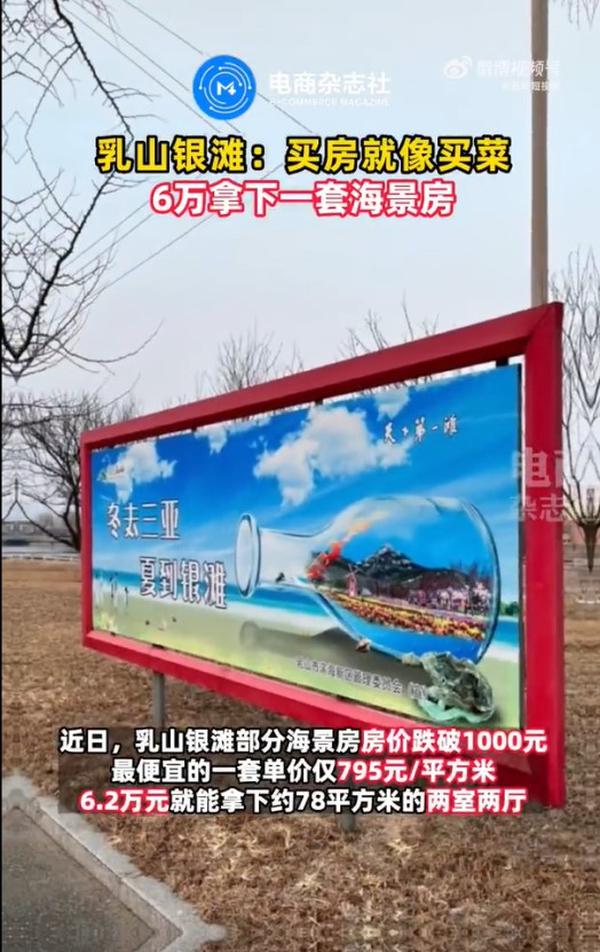 “真是白菜价啊!”据媒体获悉,近日,山东乳山银滩部分海景房房价跌破1000元/平米,最便宜的单价仅为795元/平米,6万多元就可以买到一套约78平米的两室两厅海景房!“这才是全国人民心中的房价啊!”、“全国房价都这样就挺好了。”、“这才是我心目中梦寐以求的房价。”、“谁也阻止不了房子掉价。”、“
