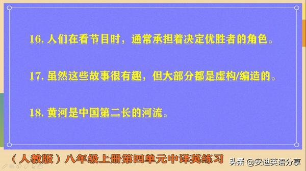 『八年级英语上册第四单元句子翻译练习』共24句,今天分享第16-18句练习!!!16. Whe people watch the show, they usually play a role i decidig the wier.(教材原句;考查短语:play a role i st