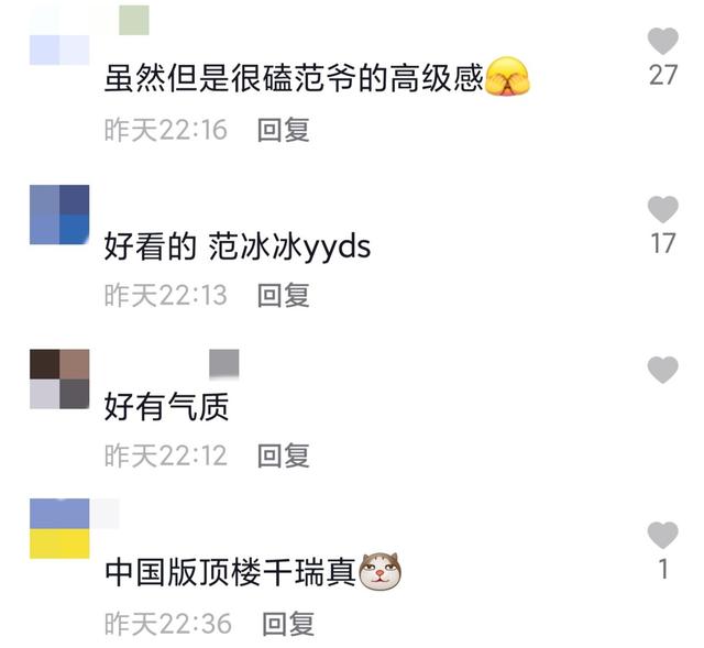 网友看了范冰冰的近照,纷纷留言夸她好美。有人狂赞范冰冰具有高级感,颜值也很在线。也有人称赞她是中国版顶楼千瑞真人,实在是太有气质了。
