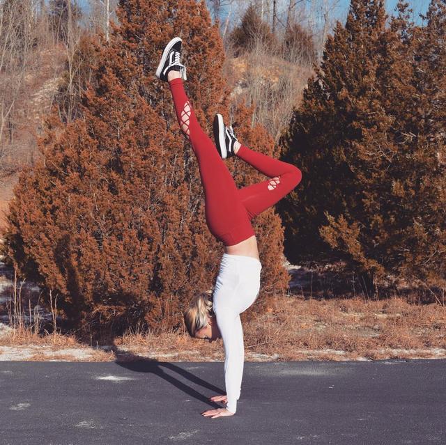 2、上半身继续向前倾,手臂用力撑起身体,上身与地面垂直,然后双脚离开地面,向上抬脚尖绷直。