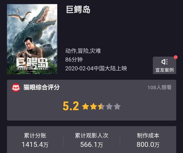 倒数TOP08:《巨鳄岛》,豆瓣评分2.9,累计分账1415.4万。