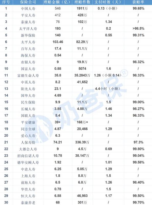 2021年部分保险公司理赔数据统计