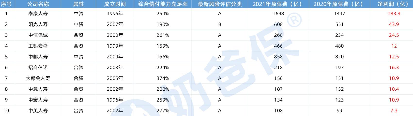 2021年人身险盈利排名