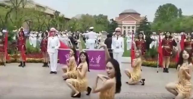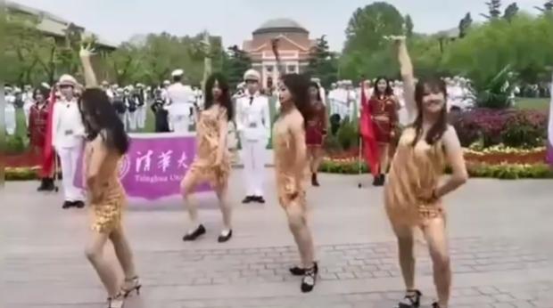 根据现场曝光的视频可以看出,九名身着金黄色流苏裙的女生在清华大学标志性大礼堂前进行着自己的表演,但由于这几个女生“亮眼”的服装造型和稍显生疏的舞蹈动作,场面一度显得尴尬。