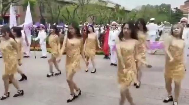 大白天的露天广场上,周围都是严肃的仪仗队,金色的身影加之“别扭”的舞姿,再配上清华大学的背景招牌,有着一种让人说不出哪种难受的违和感。