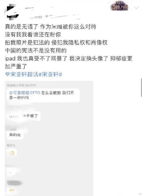 除此之外,这位私生还道德绑架宋亚轩:我真的受不了了,我决定换头像了,抑郁症更严重了。言外之意是:我都得抑郁症了,你就让我拍一下,开心开心能怎样。你微博挂我,让我抑郁症加重了,都是你的错。
