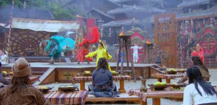 要说配色,《新还珠》还是输给《班淑传奇》,剧里这段舞,设定是个特别的舞种——刀舞。作为一个歌舞班子,团员间的默契总该有吧,但演员真是各跳各的。加上红绿黄鲜明三色,配上这动作,就像过年放鞭炮了,又像碎碎冰融化了。