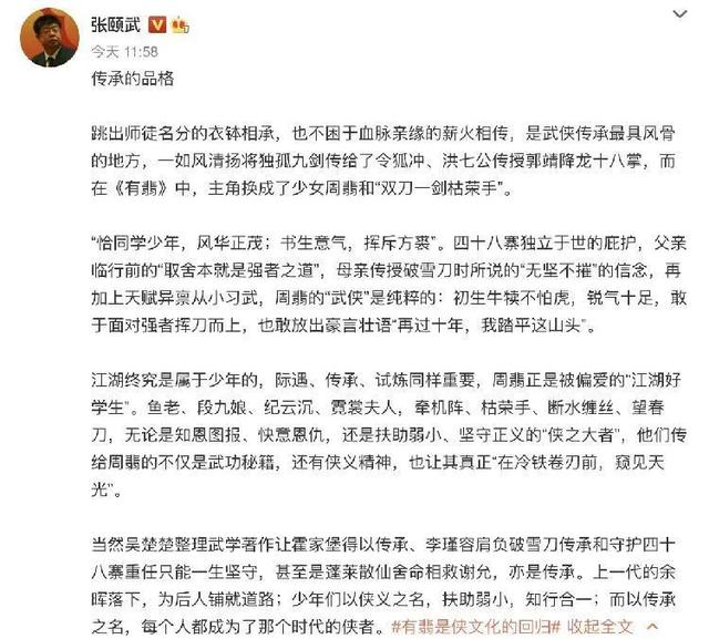 张颐武则用了《传承的品格》作为自己这篇点赞《有翡》长文的标题。他说:“跳出师徒名分的衣钵相承,也不困于血脉亲缘的薪火相传,是武侠传承最具风骨的地方……在《有翡》中,主角换成了少女周翡和‘双刀一剑枯荣手’。”