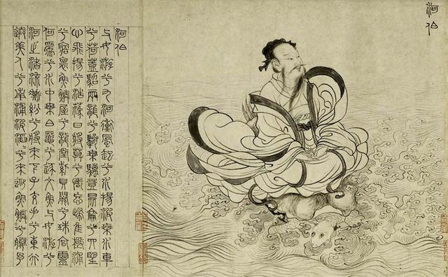 在原诗中,东君是人们想象中的太阳神,张渥却捕捉住“举长矢兮射天狼”这一爱憎鲜明的情节,把太阳神和天狼星之间的矛盾冲突集中在一个画面上。太阳神被描绘成一个全副武装、魁梧雄伟的武士,一手持弓,一手握箭,翻身怒视天狼星,须眉怒张,强调了他的勇武;衣带飘拂,加强了动势的表现。天狼星则被画成一个小小圆球,仿佛摇摇欲坠。这种艺术处理充分显现了原诗中那种热爱光明、仇视黑暗的思想感情,比之孙承泽旧藏传李公麟《九歌图》中髭须飘洒、抱弓而立的东君,从思想内容到艺术技巧都增加了新的内容。河伯骑于海龟之上,其衣服帽带的飞扬,波涛的奔涌,把河伯迎风破浪前进的形象淋漓尽致地表现了出来。