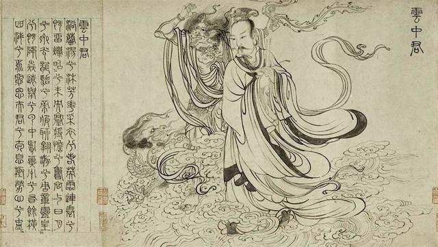 紧随屈原像后,作者依据《九歌》原诗的情节逐一绘制出东皇太一、云中君、湘君、湘夫人的形象。画家熟练地运用线条长短、迂回、曲直变化,流畅飞扬,宛似行云流水,人物形象充满了各自的不同神韵。大司命手执拐杖,头上几根洗练的线条和些许淡墨晕染,恰如其分地表现了纱巾透明的质感,其下的发髻隐约可见。衣裤则用比较劲秀而又略有不同的线描画成,使人觉得衣与裤的质料也有所差异。至于面部和双手,用笔更细、更淡、更柔、更富于变化,枯笔画成的须眉成功地表现了它的疏落和蓬松,一副老年人的沧桑感突现出来。少司命左手执笔,右手握卷,慈眉善目,飘浮于祥云之上。左一持杖侍女似正听其嘱咐。东君浓眉大眼,鬓须满脸,手持法器,立于祥云之上。