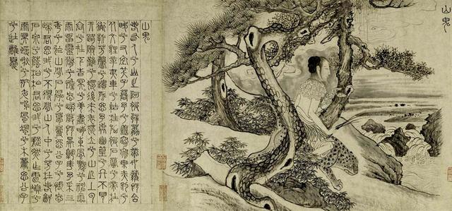 《山鬼》是屈原《九歌》11首诗中最摄人魂魄的一首,它出自楚国一个美丽凄婉的传说,描写一个美丽而幽怨的女神。画卷中的山鬼裸体骑赤豹于松林之中。《国殇》原诗用较多的篇幅描写将士们奋不顾身英勇作战的场面,画家则根据原诗精神,通过一个侧面,充满想象力地进行了生动的描绘:用苍郁的笔法略施渲染,绘成几株参天大树和树下挥戈而前的勇士,铠甲的明亮与树石的阴郁形成了鲜明的对比,从而突出了人物形象。树下走在最前面的人怒目仰视,张口狂呼,仿佛可以听到他叱咤风云的不息喊杀声。在他的身后,无数战士的头在树木的繁枝密叶间攒动。这里,画家的笔墨非常精练,能看到的只有几个被枝叶遮蔽得不完整的头部,但却突出了勇往直前的眼神,成功地运用了构图的掩映和读者的错觉,因而落墨不多却表现了千军万马不可压倒之势。