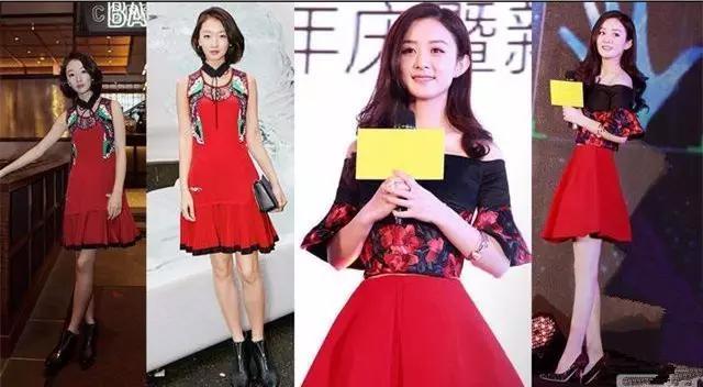 周冬雨红色的复古风的裙子,裙子下摆百褶的设计,看起来俏皮可爱。赵丽颖一字肩伞裙,一双黑高跟,显腿长,性感十足。