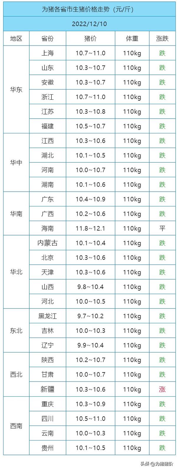 12月10日猪价 | 北方扛价地区将小幅反弹!今日全国生猪收购均价呈现下跌态势,全国均价10.43元/斤,环比昨日下跌0.3元/斤,上涨地区1个,下跌地区26个,稳定地区1个,全国生猪收购最低价为新疆,价格为10.3元/斤,最高价为海南,价格为12.1元/斤。北方地区屠宰企业白条猪出栏价格降幅