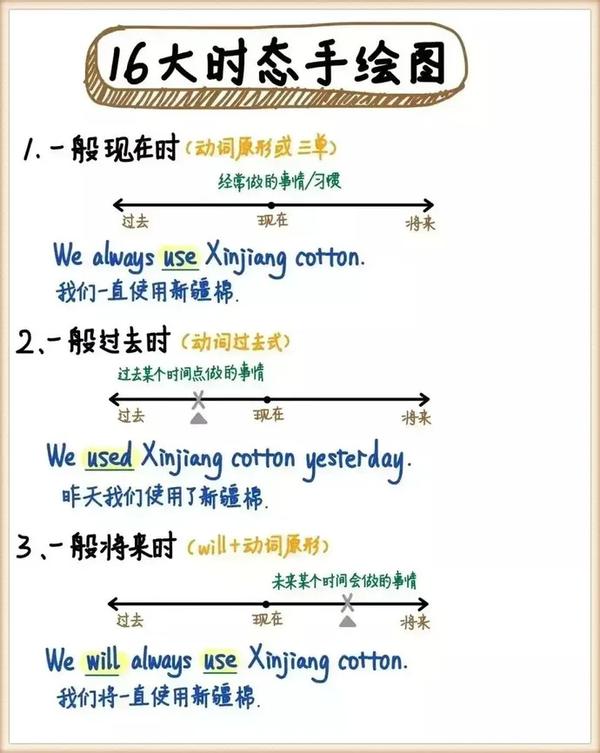 英语干货!手绘的英语16种时态图,一看就会,一点就通!,英语老师真牛!这配色我爱了!几张图就将英语16大时态和介词i、o、 at的用法全部理清了,每一种时态表达什么意思,在何种场合使用,使用时,有哪些固定搭配,一应俱全!这份资料不仅小学能用到,初高中学的也是这16种时态,而