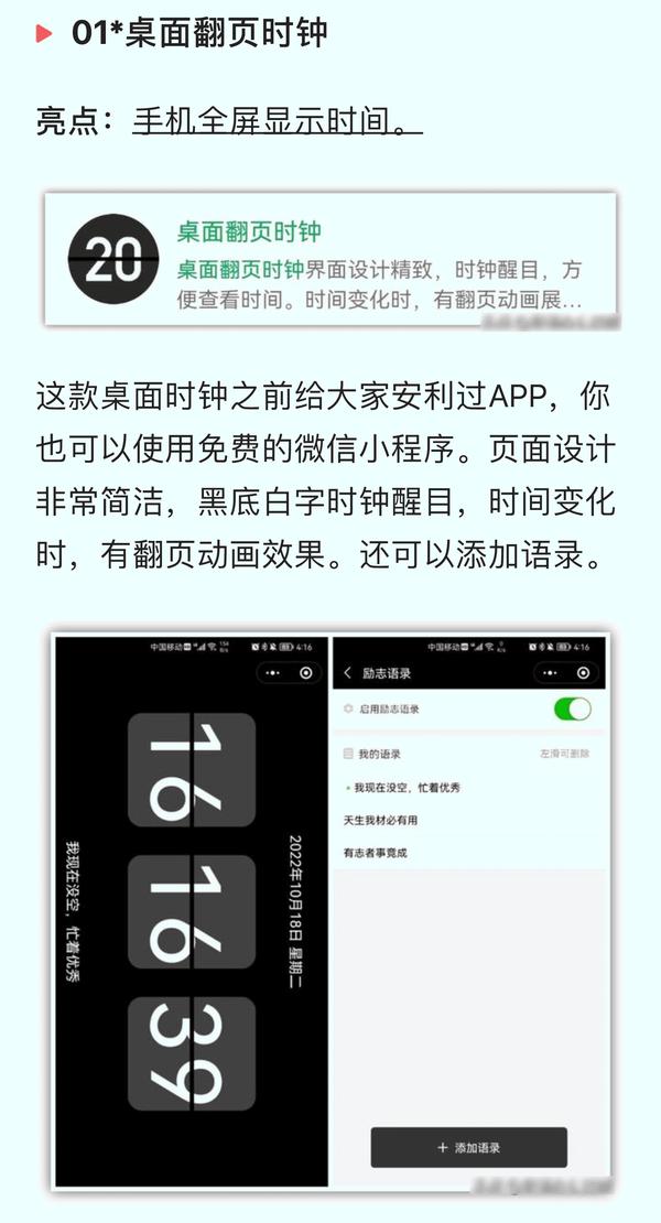 6个压箱底的微信小程序,个个都暗藏惊喜!请你低调使用~1.桌面翻页时钟:手机全屏显示时间。2.智能翻译官APP:翻译文字和图片。3.报告查一查:查询各行各业的数据。4.多抓鱼:二手书交易,买书和卖书。5.鲨鱼记账:记录生活中每一笔账单。6.闪萌表情:查找和