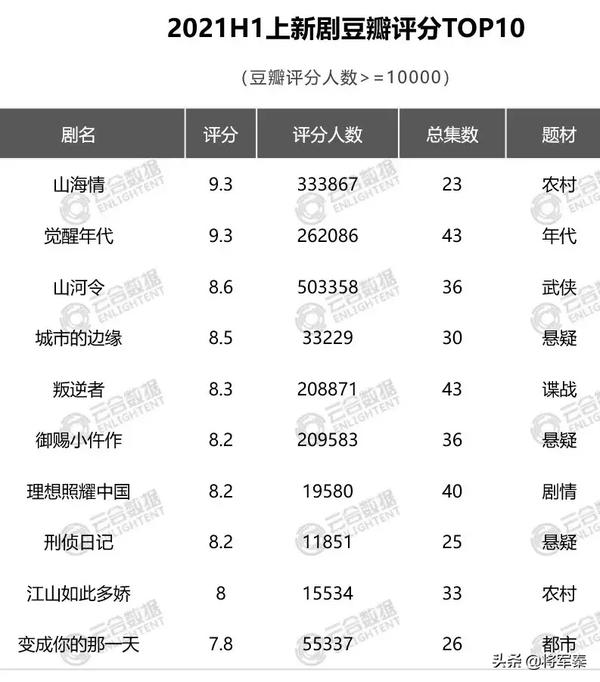 根据数据分析,2021年电视剧上数据分析,根据数据报告前十的电视剧作品有《山海情》《觉醒年代》《山河令》《城市边缘》《叛逆者》《变成你的那一天》《江山如此多娇》《理想照耀中国》《刑侦日记》《御赐小仵作》。今年上半年的数据为1575亿,比同环比分别下降36%和11%,每一年都会出现很多电视剧,但是